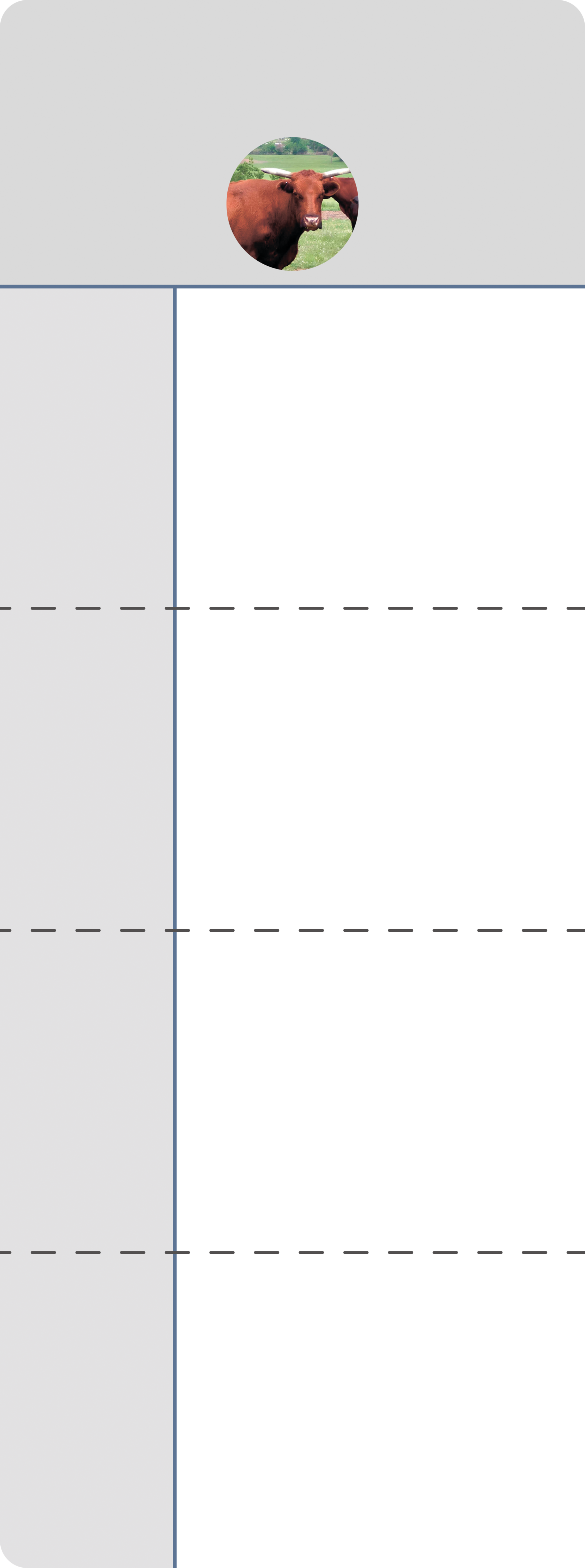 От Герефорда надеялись получить скороспелость и крепкие задние ноги, от Ангуса — мраморность мяса и легкость отела, от Африканера — хорошую молочную продуктивность и окрас, дающий устойчивость к жаре, а от Шортгорна — мясную продуктивность.
